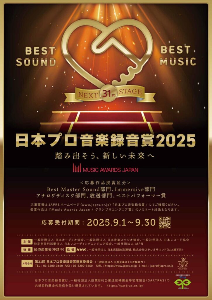 「第31回 日本プロ音楽録音賞」は、9月1日(月)から9月30日(火)まで作品の応募を行い、12月5日(金)「音の日」(※本来は12月6日ですが、土曜日につき1日前倒し)に授賞式の開催を予定しております。